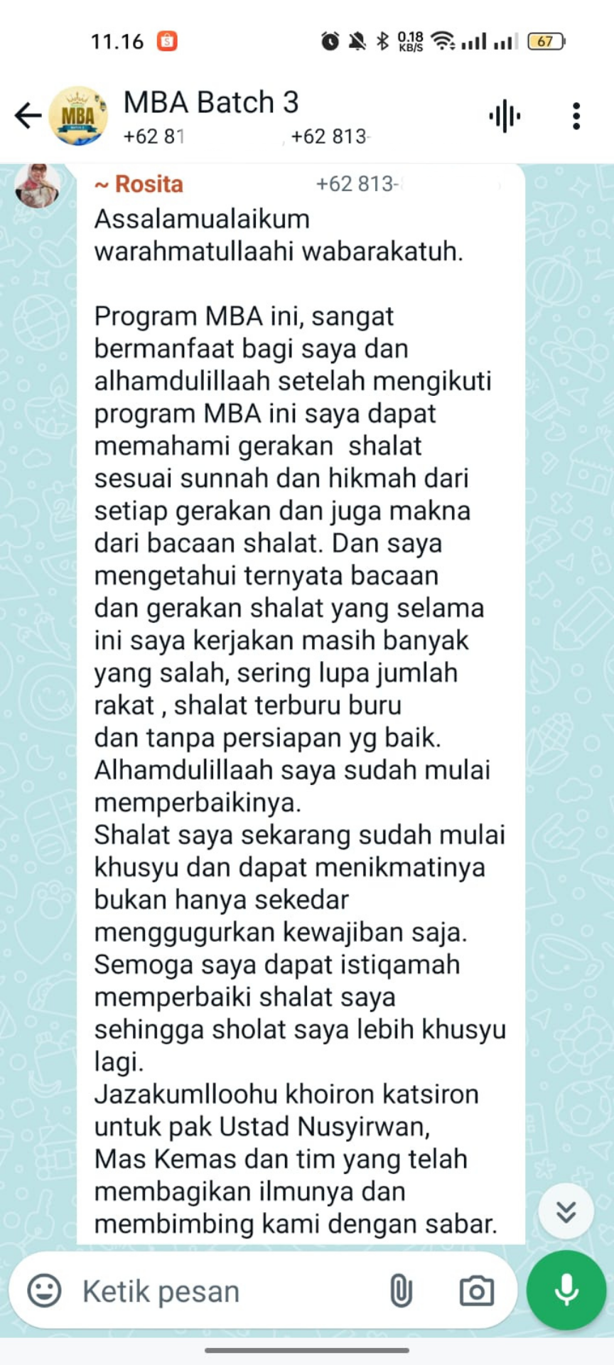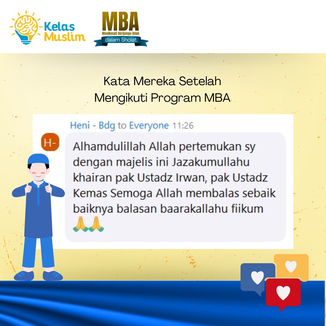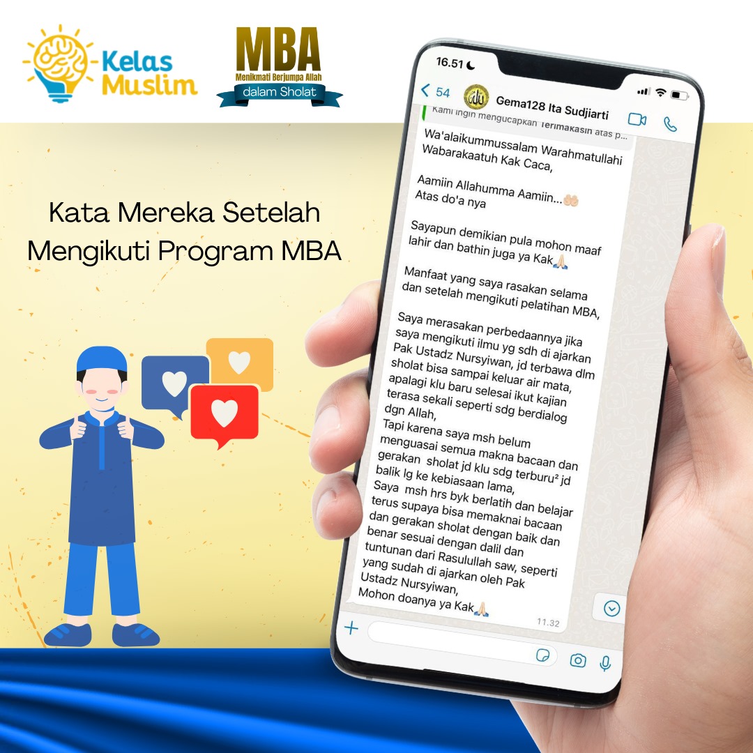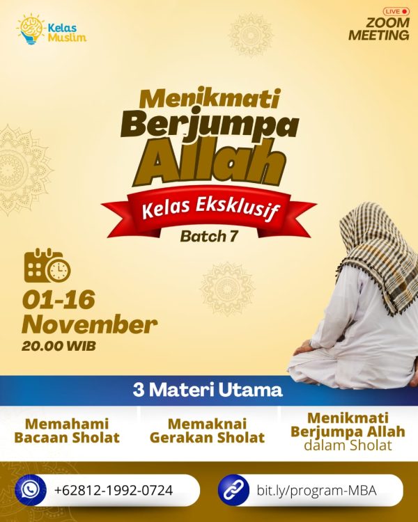 Program MBA (Menikmati Berjumpa Allah) adalah pelatihan online yang dirancang khusus untuk membantu kaum muslimin meningkatkan kualitas sholat mereka menjadi lebih khusyuk dan bermakna. Program ini berlangsung selama 3 pekan, terdiri dari 6 hari pertemuan Zoom interaktif dan 10 hari bimbingan intensif melalui grup WhatsApp.